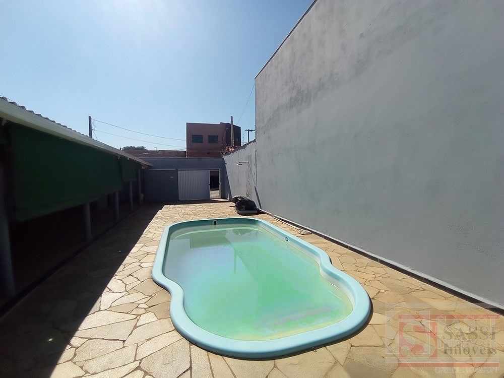 Área de lazer com 01 quarto, cozinha com armário, banheiro, varanda com churrasqueira, piscina, banheiro externo, ampla área para carros.